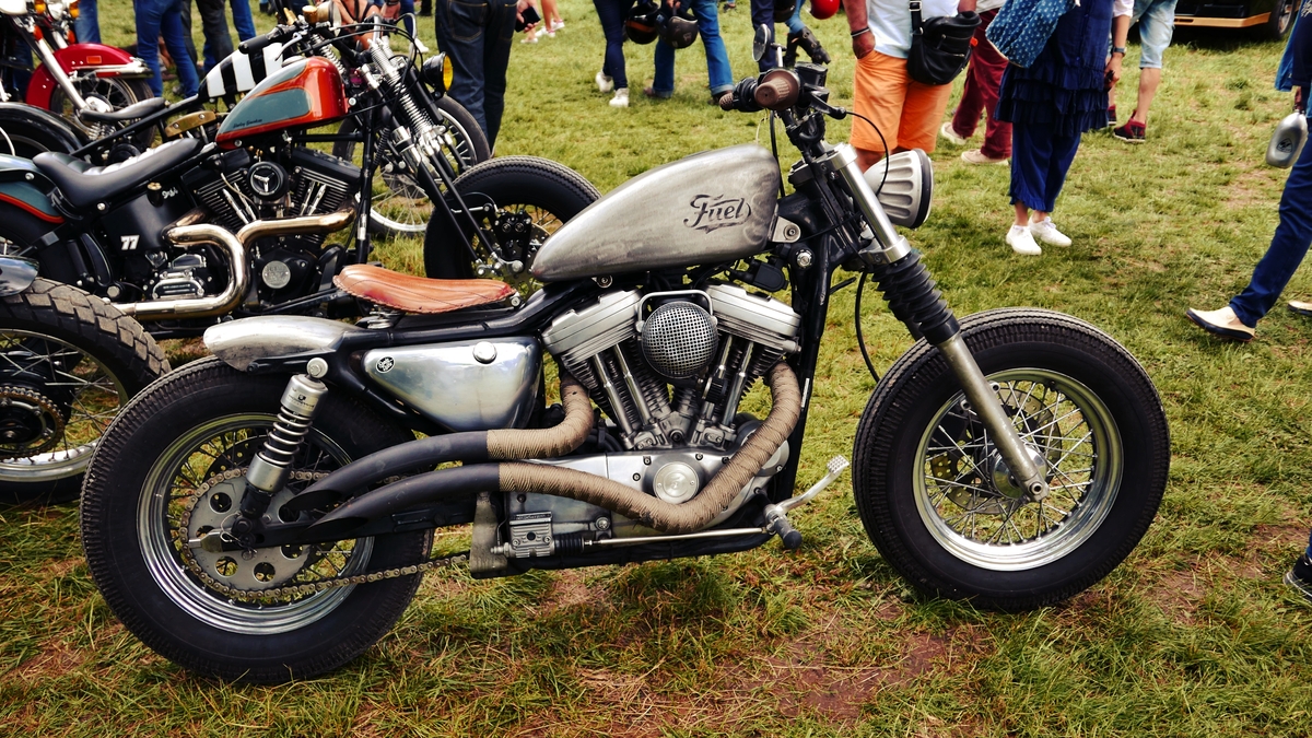 Dans des espaces dédiés, on pouvait alors admirer pas mal de Twins de Milwaukee, mais pas que, dont quelques Knuckle de derrière les fagots et une belle brochette de Shovel. Les voitures se taillaient la part du lion. Un beau petit lot de VW, par ici, une foultitude de V8, oscillant entre rods rageurs et péniches placides, quelques belles européennes et un village d'exposants très orienté "vintage". Etonnant.